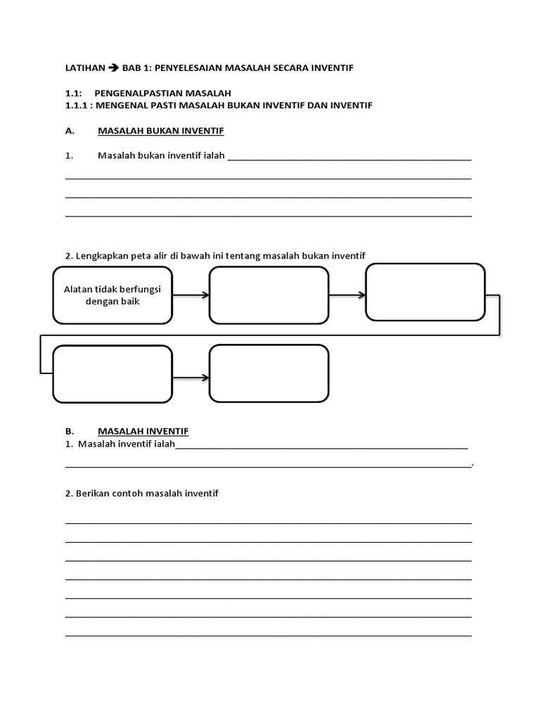 A pemikiran yang kurang matang b pertambahan masalah c satu pengalaman yang baharu 6 Apakah langkah terakhir dalam carta alir proses. Senaraikan langkah-langkah penyelesaian masalah bukan inventif. 2 Menyatakan maksud masalah bukan inventif dan inventif dengan membuat hubungkait.